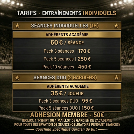 Des entraînements personnalisés pour travailler chaque aspect du poste de gardien de but : technique, explosivité, lecture du jeu et mental. Adaptés à toutes les catégories, de la pré-formation aux seniors, pour hommes, femmes, garçons et filles. Un suivi toute la saison et un accompagnement sur mesure pour progresser rapidement et atteindre votre plein potentiel.