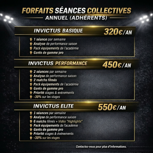 INVICTUS GK ACADEMIE propose des séances spécifiques pour les gardiens de but directement au sein des clubs : écoles de football, pré-formation, formation et seniors. Nos entraîneurs diplômés assurent un suivi technique, physique et mental adapté à chaque joueur.